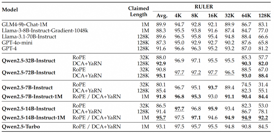 除了长序列任务的性能外,模型在短序列上的表现同样很重要。在广泛使用的学术基准测试中比较了 Qwen2.5-1M 系列模型及之前的128K版本,并加入了GPT-4o-mini进行对比。